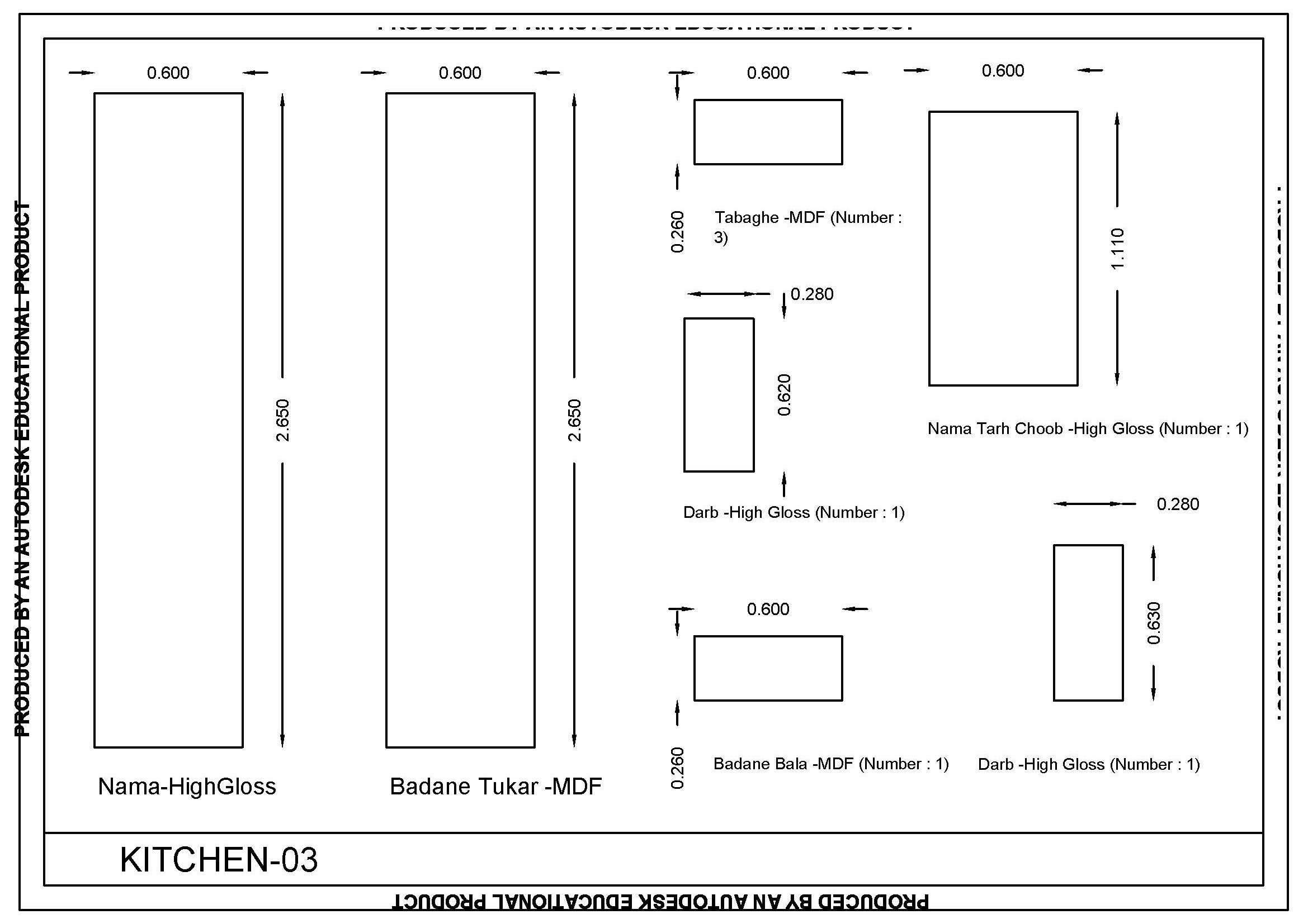 یکی از نکاتی که در طراحی کابینت و فضای آشپزخانه بسیار کلیدی خواهد بود، نقشه ها و جزئیات اجرایی کابینت های می باشد. این بخش از نقشه ها برای جلوگیری از هر گونه پرتی و هدر رفت MDF و هایگلاس مورد نظر می باشد. با توجه به آنکه ابعاد ورق های MDF و هایگلاس مشخص می باشند، وجود یک نقشه دقیق و جزئیات آن سبب می شود که تقسیم بندی صفحات جهت برش در بهترین حالت ممکن صورت گیرد. تصاویر شماره 5 الی 8 نقشه های مورد نیاز این امر را به نمایش گذاشته اند.