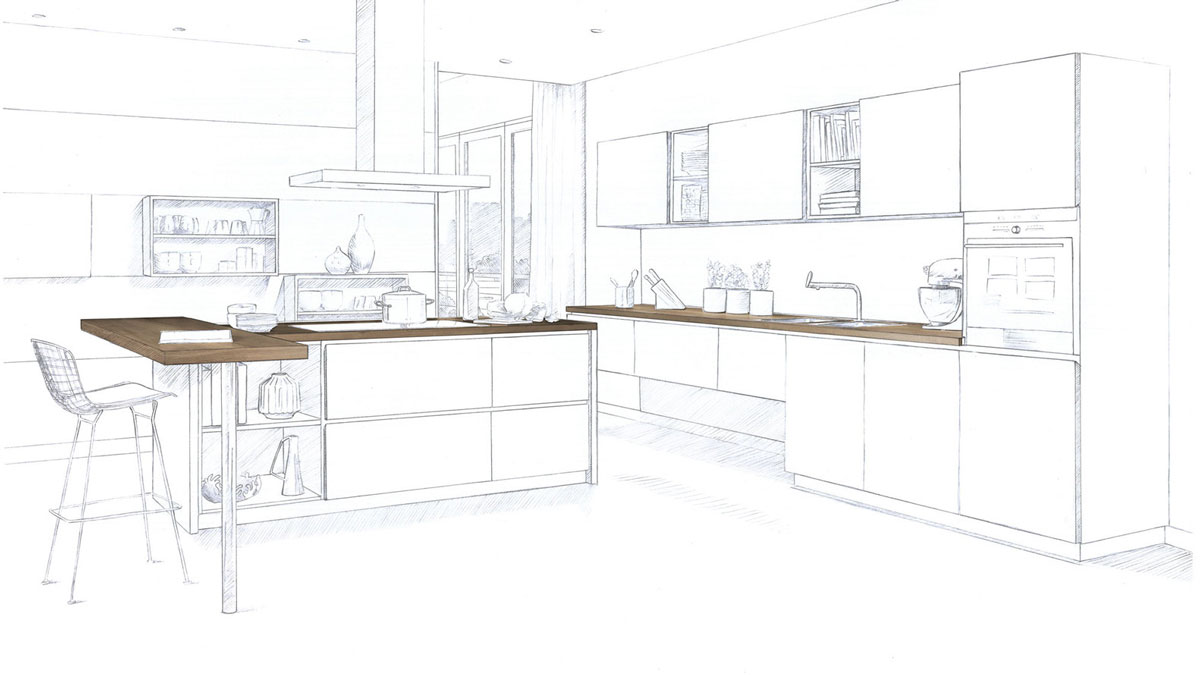 در این مرحله با توجه به فضای موجود (ابعاد تیین شده در نقشه ازبیلت) و نیز با در نظر گرفتن مبلمان آشپزخانه (یخچال، گاز، سینک، هود، ماشین لباسشویی و ظرفشویی)، اتود ها و ترسیمات اولیه صورت می گیرد. این امر به نحوی در نظر گرفته می شود که ابعاد استاندارد هر یک از مبلمان در بازار و نیز ابعاد استاندارد یونیت های آشپزخانه که مطابق آن ساخته می شوند، با دقت لحاظ گردند.