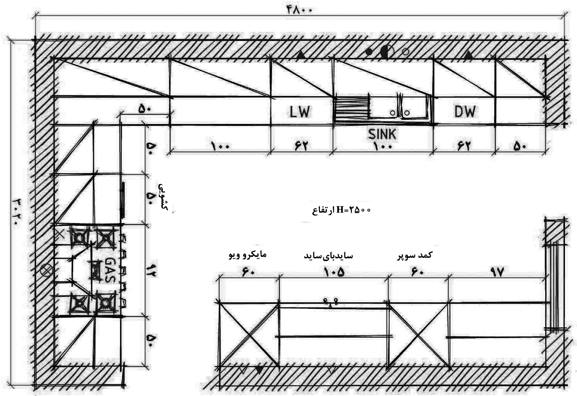 در این مرحله، با توجه به کابینت های استفاده شده، مبلمان آشپزخانه و ابعاد فضایی آن، ابتدا یک نقشه دو بعدی به عنوان پلان تهیه می شود. در این نقشه ابعاد دقیق کابینت های موجود و جزئیات آن، جانمایی لوله های فاضلاب دیواری، جانمایی پریز های برق، تلفن و کلید های روشنایی تعیین می گردد.