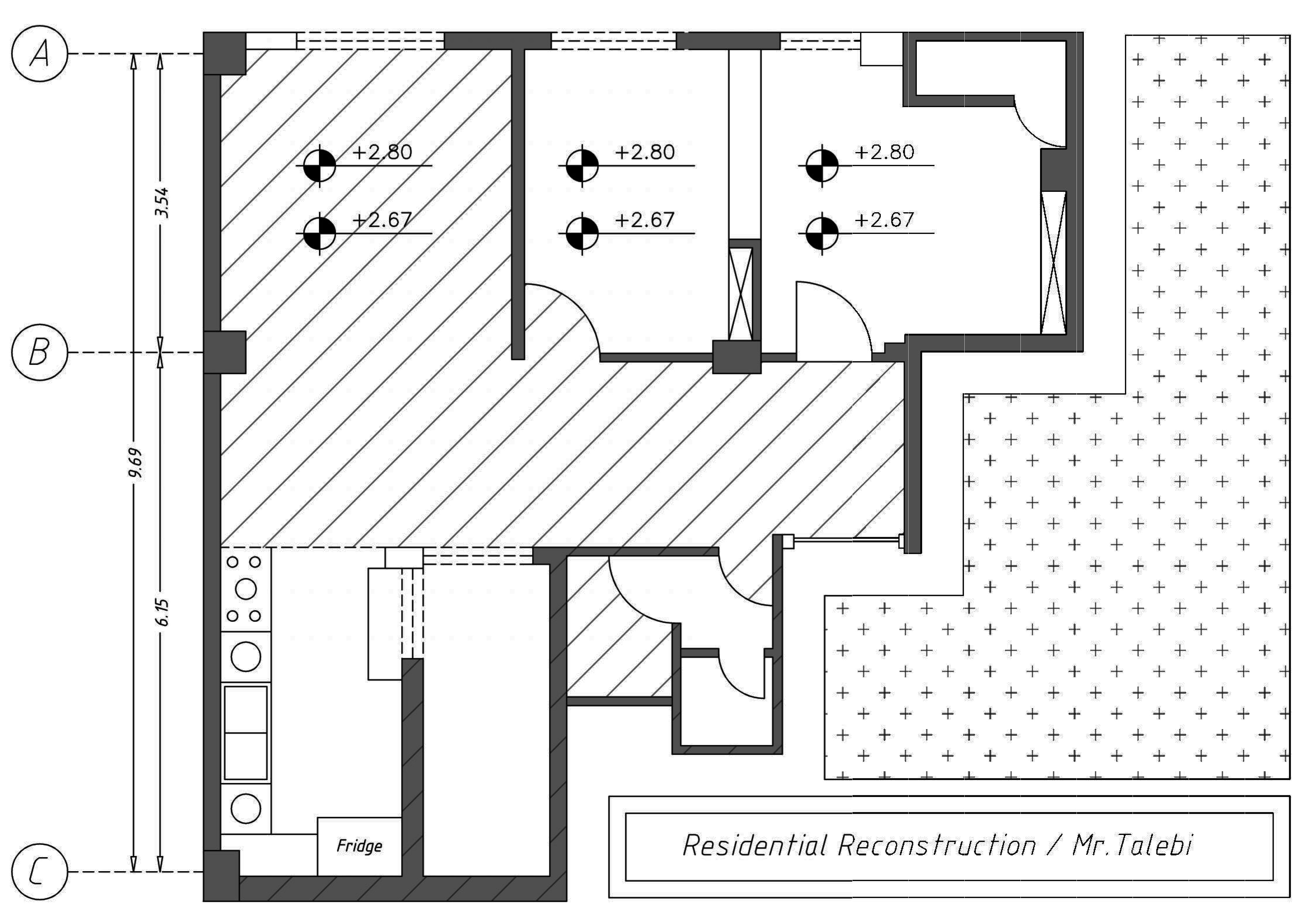 تصویر سمت چپ نمونه ای از برداشت اولیه از وضعیت موجود یک واحد مسکونی را به نمایش گذاشته است. در این واحد مسکونی جابه جایی اساسی در دیوار ها و فضا های داخلی مورد نظر نبوده است و برداشت اولیه صرفا جهت دریافت دقیق اندازه ها و نیز استعلام هزینه صورت گرفته است.